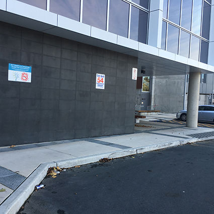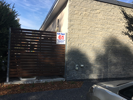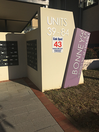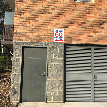 Whether you own a business, work for an organisation or are a member of the public, we are here to help you improve access to taxis at your location. CabSpot signs are installed at private business addresses with difficult booking locations, such as venues with multiple entrances that cause confusion for passengers and taxi drivers. For example, a shopping centre could utilise CabSpots to identify multiple entrances using different identifying numbers. The CabSpot sign is fixed to a building wall, or similar prominent place belonging to the business, which is in easy sight of an arriving taxi.